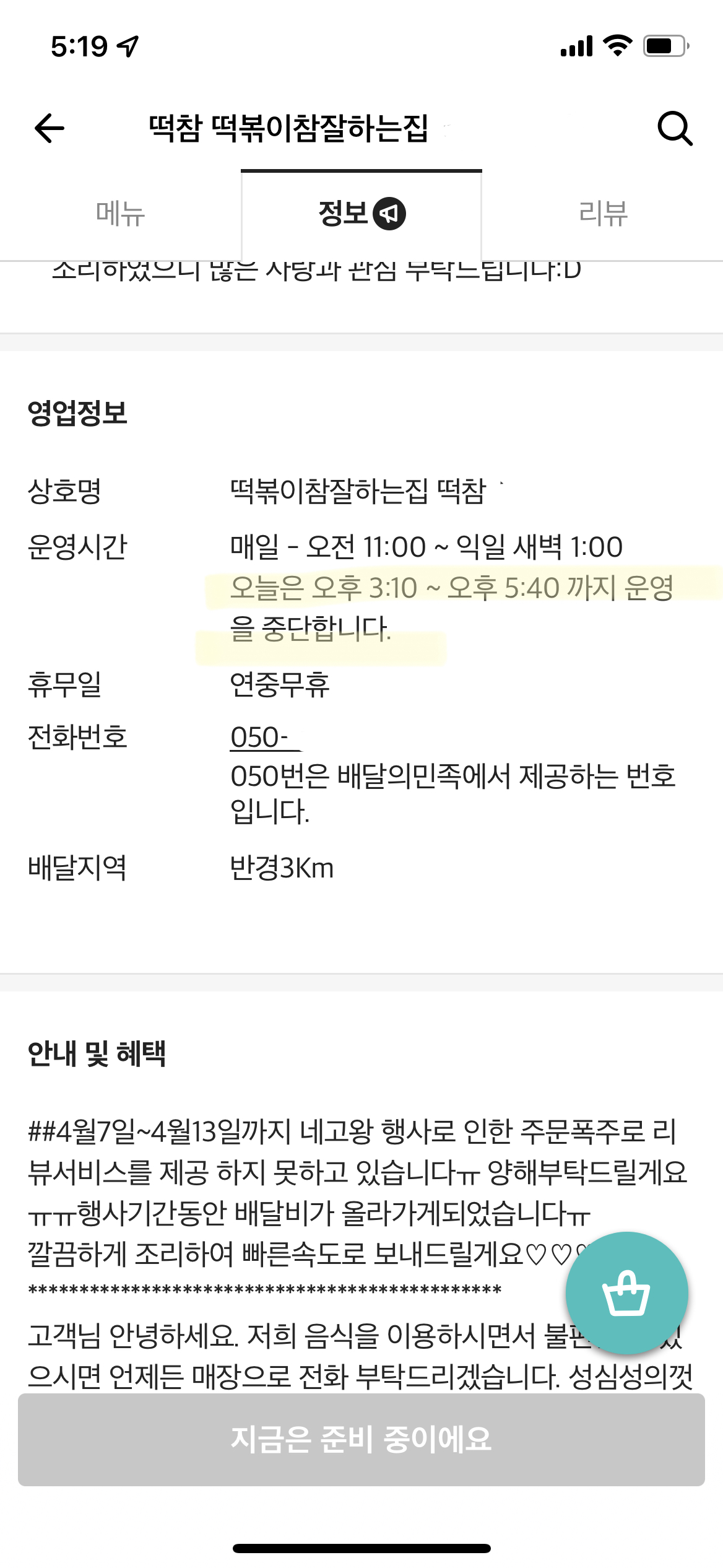 배달의 민족에서 대부분의 떡참 가게가 준비중으로 떠 있을텐데요,
