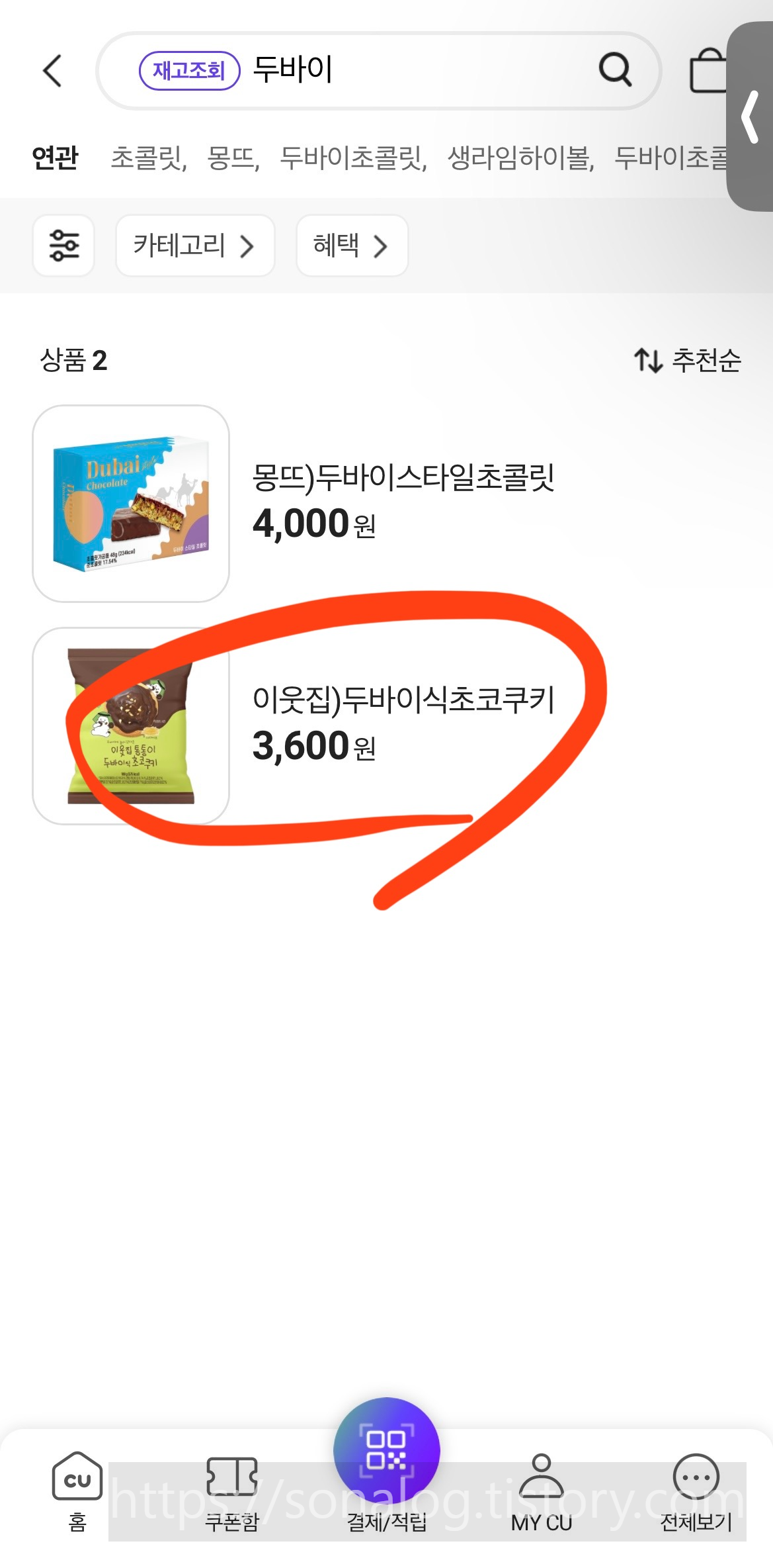 1. 포켓CU로 두바이식 초코쿠키 재고조회 하는 방법